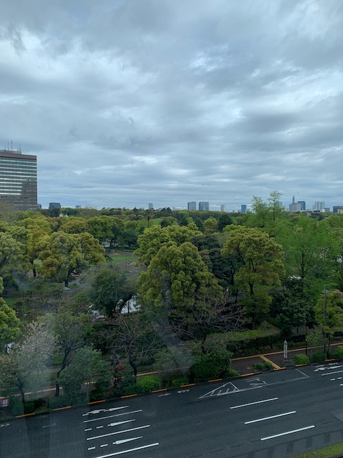 上映中の映画のビジュアルをバーンと飾っている映画館ではなかったので、大きな窓から見下ろせる、日比谷公園を激写。