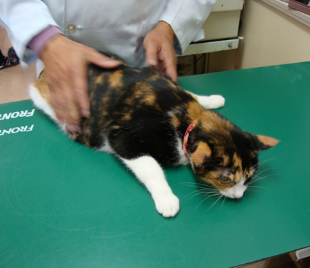 まな板(診察台)の上の猫。