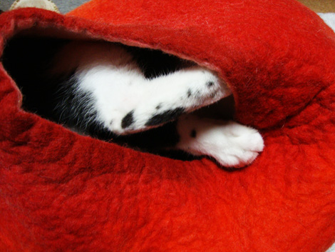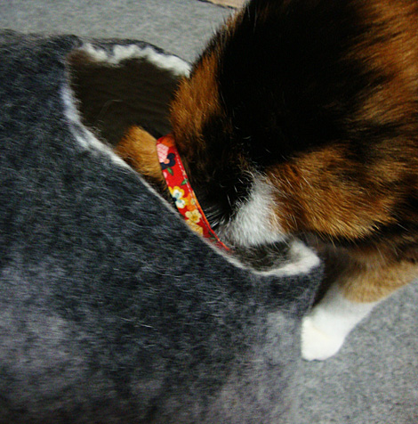 一方の三毛嬢。同居人の好みでグレーが彼女のベッド。警戒心が野良猫並の三毛嬢は、顔を突っ込むだけ。1週間程経ったけど、自ら中へ入ってくる姿はまだ見れず…。いつかなー。