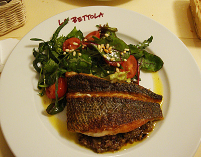 いよいよメインの登場です。鱸のグリル(ソースの名前が難しくて…泣。トマト・バルサミコ、この2つがポイント。他に2種あり)。