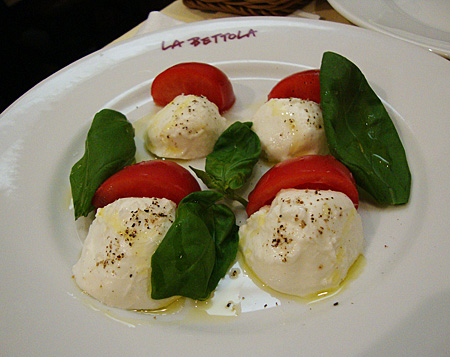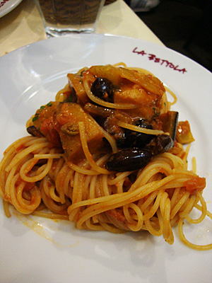 同行した同居人も大盛りで頼んだ茄子とケッパーのトマトソースがね。何の手違いからか、遅れてしまうと詫びながらやってきた店員さんが、よろしければこちらをお召し上がりになってお待ちを…と出してくれた一皿。