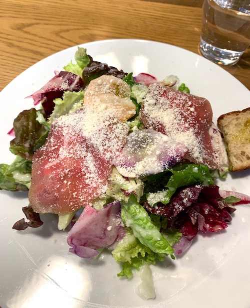 ほどなくして出てきたサラダは、ランチに付いている、というレベルではいつも素晴らしいと感心するボリューム。通常はハムですが、前日のディナーの食材の動向で生ハムになることがあったりします。