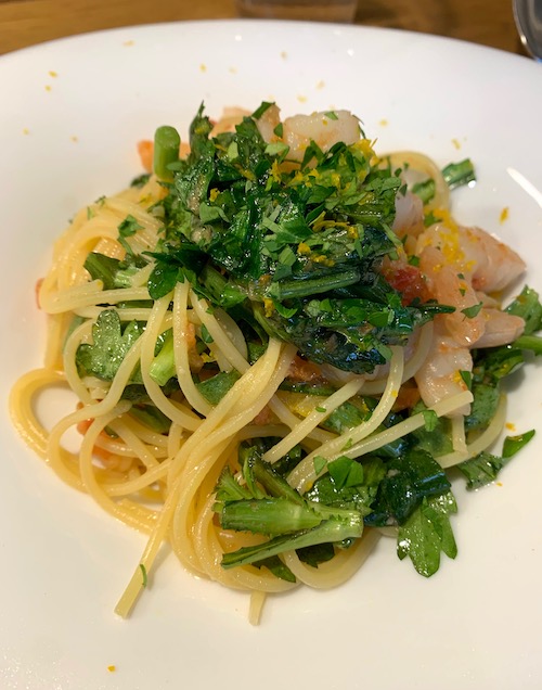 パスタはこんな感じです。ゆずの香りがとても豊か。削って散らされたものだけでなく、刻んだ皮も入っていました。
