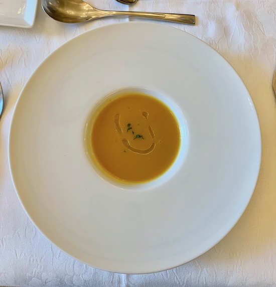季節のポタージュからスタート。説明してくれるのが、私と逆端で、聞こえなくて…!