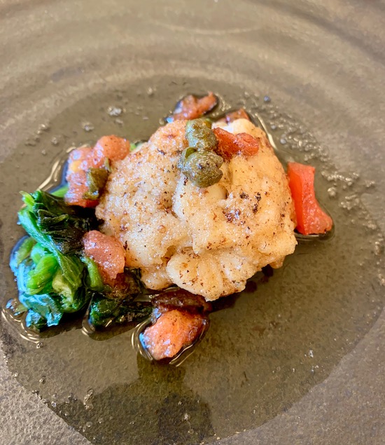 真鱈の白子の焦がしバター仕立て、とかなんとかそんな感じです。私、白子を初めて食べることに。見た目が絶対に受け付けられないものなのですが、これなら大丈夫。しかし、うわ、実は美味しかったんだね!とはなりませんでしたが。トマトやほうれん草のソテーはちゃんと味わいました。