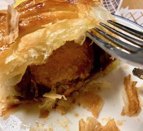 カレーパイでメンチカツ、どういうこと?と、ドラマを見ていない私はそこばかり気になって、もう一つのコロッケと、どっちにすべきかをずーっと迷い続け、でも、芋かぁ、うーん芋なら肉をもっと食べた方がいいよね…ということで、メンチカツをチョイス。