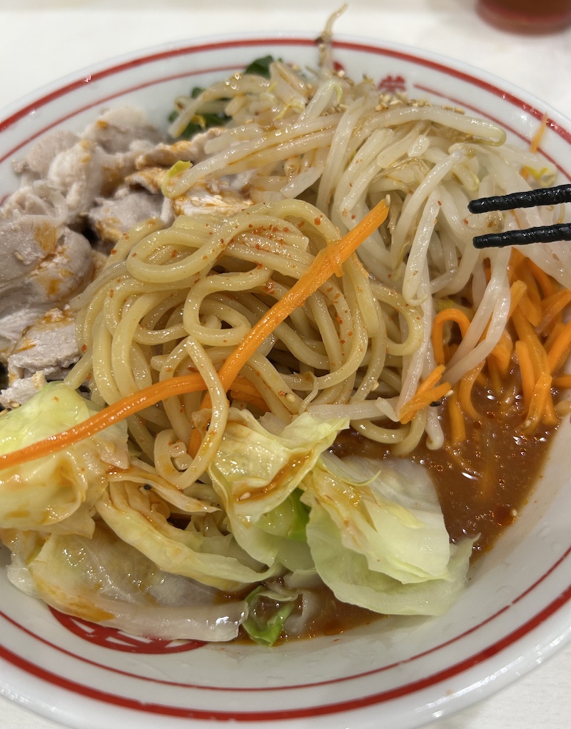 これがまたキンキンに冷えていて、ますます歯応えがすごいの。麺硬め、なんて言わなくて良かったよとまず思ったくらい。この引き締まった中太麺を同じくらいの太さのニンジンやもやしと一緒にざくざくと歯応えを楽しむ。たっぷり野菜は、1.5玉の麺に十分付き合ってくれました。