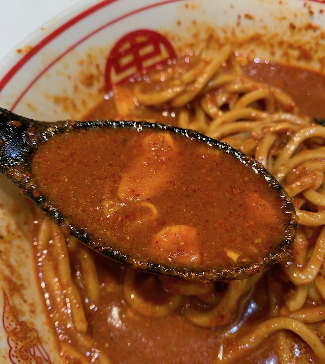 少々スープにニンニクを解きつつ混ぜたところで寄りで撮影したところがこのような感じ。なんというか、濃さ、伝わっておりますでしょうか?伝わっていてほしい!