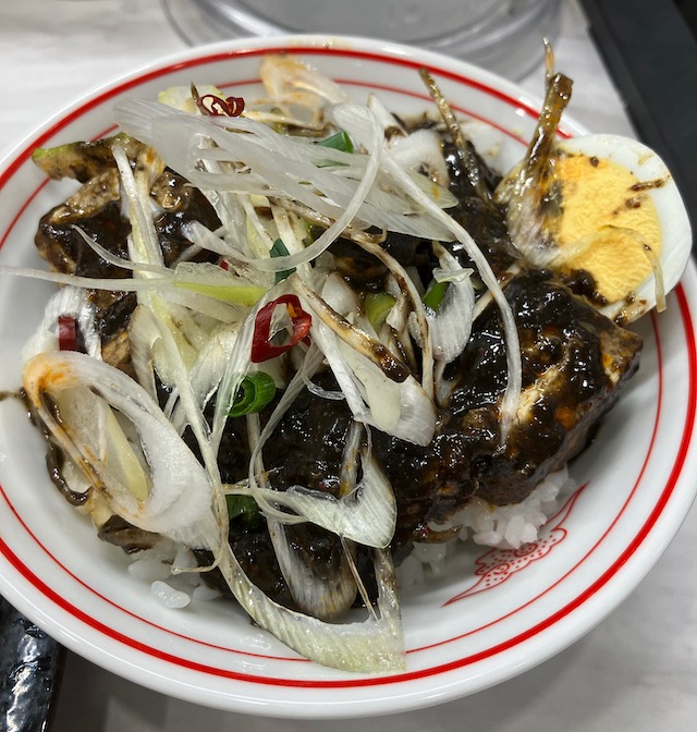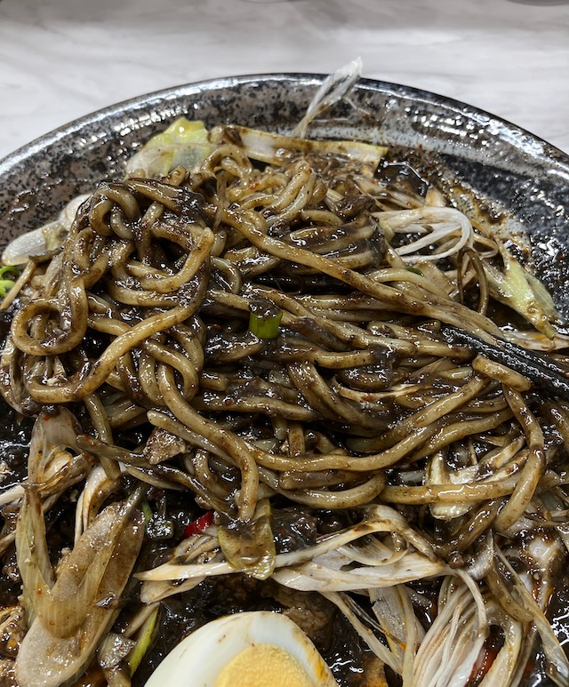 やっぱりなんというかびっくりするよ、この黒餡。いつもよりも中本の中太麺が白く見える。