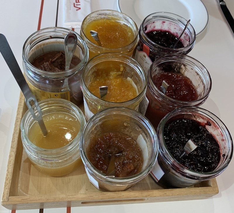 しばらくすると、コンフィチュールとはちみつ、チョコレートクリーム(ジャンドゥーヤなやつ)のトレイが運ばれてきた。