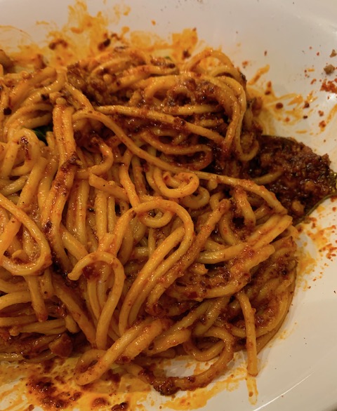 するとこんな感じになりました。麺が白くてストレートだったし、タレがよーーーく絡んで、鼻をくすぐってくる匂いは違うけど、なんだかもう、スパゲッティミートソースにしか見えないと思いつつ、一口。