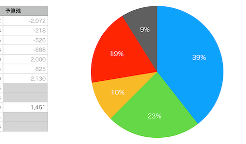 予算残は勘のいい人ならすぐに分かるとは思いますが、項目ごとに立てた予算の残高です。この期間、実はまだ締め日まで10日を残しているというのに、残りが、、
