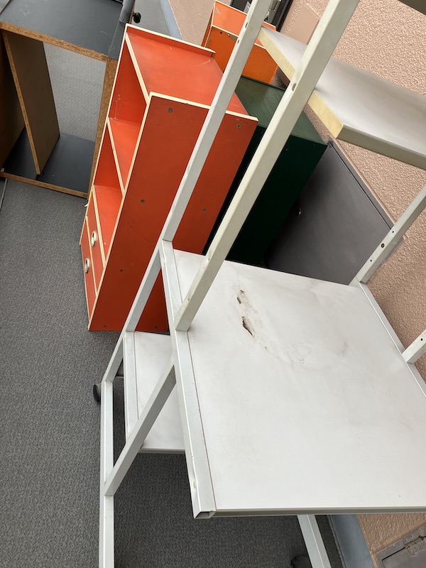 カラーボックスやらパソコンデスク、テレビ台。どれも30年以上前、オレンジのカラーボックスはおそらく40年超物。ただただ不用品が格納されて置かれていただけの、とっくに役割を終えているような物たち。