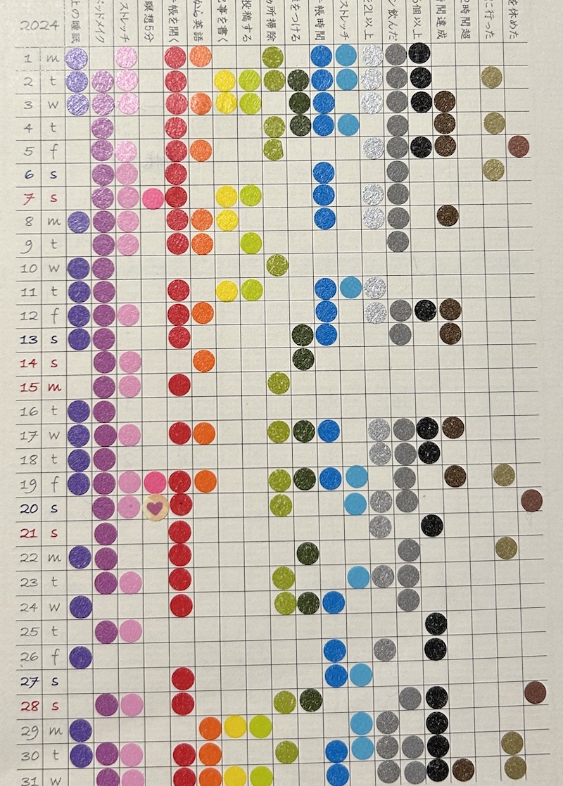 随分前に揃えたマステの丸シールをせっかく買ったのだし使わないとね!という気持ちもあってのトラッカー。結構前からやっていたものの、ひと月を通してできたのは久々だったかも。