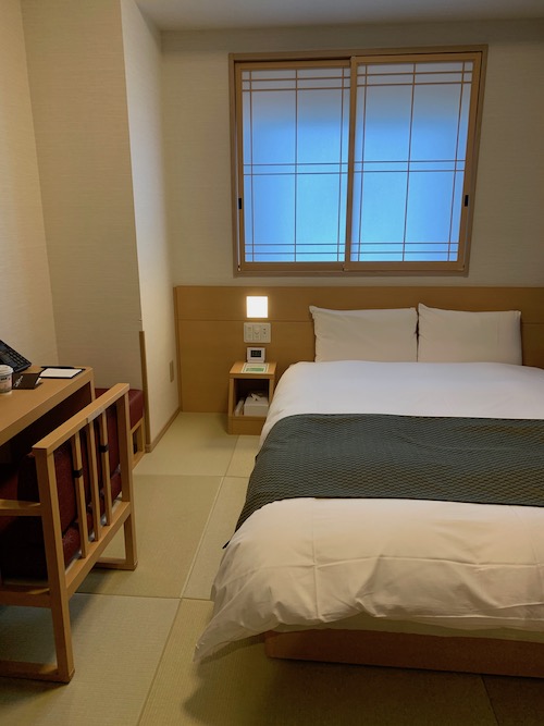 室内は和室風だけどベッド。和洋室になるのか、必要なものがコンパクトに揃った落ち着く部屋でした。