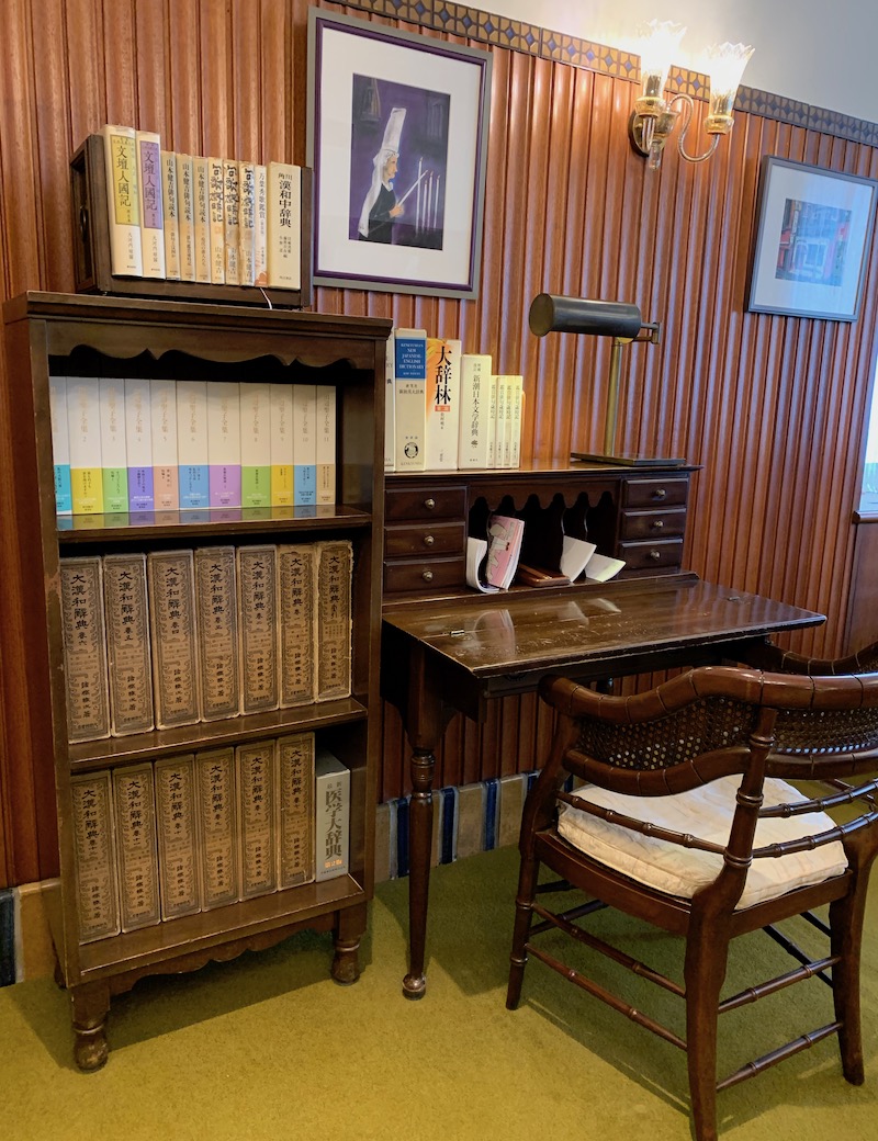 チェックイン時間より早めについたため、応接室という感じのステキな場所で本を読みながら待つ時間。おかげで書き物机や本棚などの調度品をじっくり堪能できた。