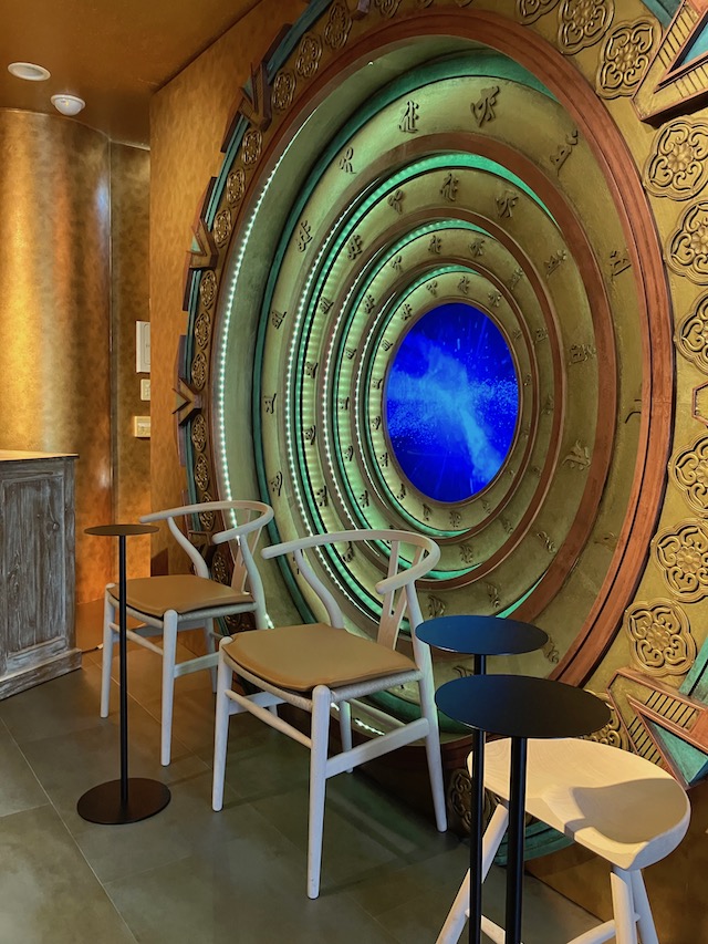 ワッフル地のガウンに着替え、もこもこのルームショートブーツを履いたら、案内されるのは、大きめのかまくらのような印象の冷凍庫です。ドーム型の天井には無数のLEDライトが青白く輝いており、冬場によくニュースで見るアイスホテルのようだなと思いました。