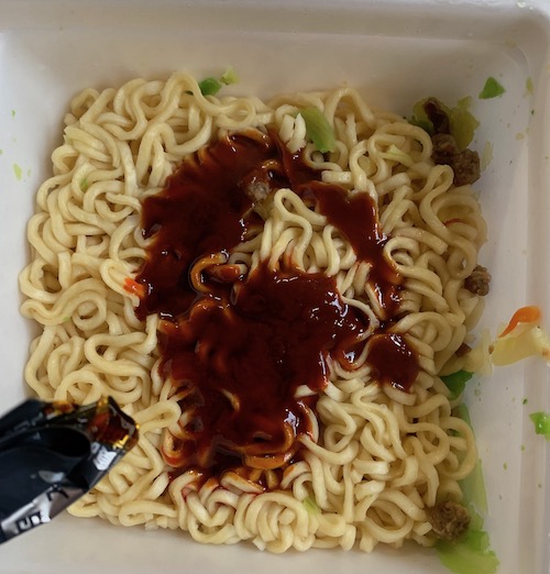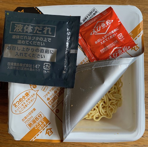 問題というのは、この小袋の1つ『えび魚粉』。私は甲殻類の殻部分にアレルギーがあるので、えび魚粉をかけないで成立するものでないとねーと思っていたのでした。