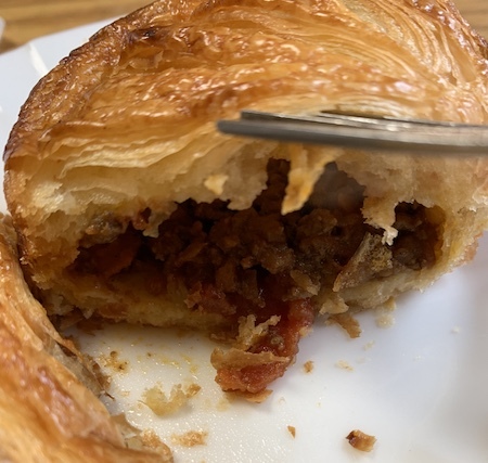 なんと、「カレー風味のフィリング」との説明。実は、カレーパンだけは大変だから手を出さないと心に決めている程度にはカレーに目のない私。生活圏からいって便利な場所とも言い難く、二度と来ないかもしれないし、とミートパイもゲット。