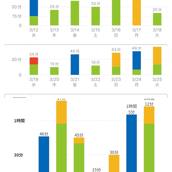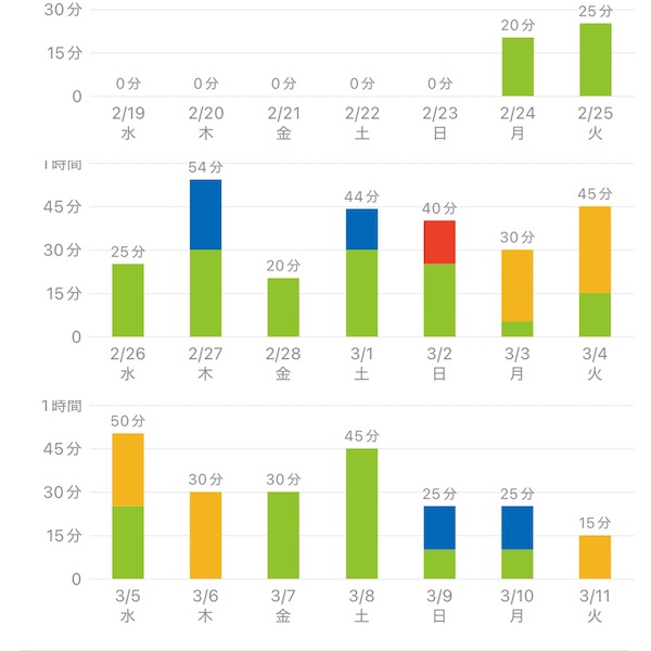 日付が隠れちゃってる部分、study plus のアップデートで表示が変わりましたが、だんだん時間が長くなっているのが面白く、その間に谷になっている15分の日、書類が納品されて疲れ果ててたあの日かな、みたいな。