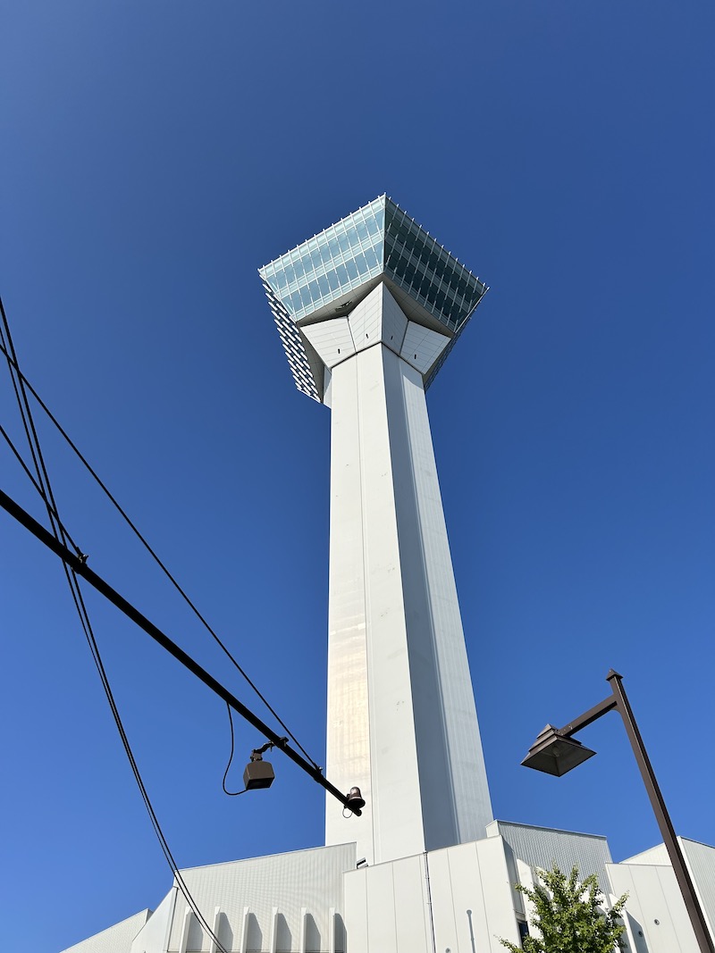 見えてきた五稜郭タワー。すごい、面白い!こんな形の建物が。