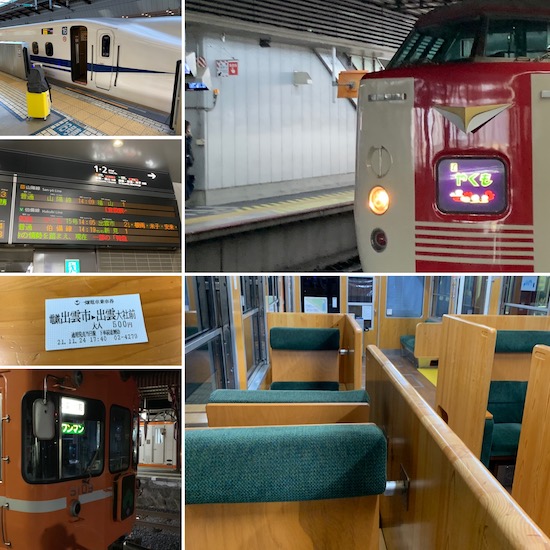 東京駅出発ののぞみから、岡山で乗った特急やくもと、出雲から先の一畑電車とその車内。