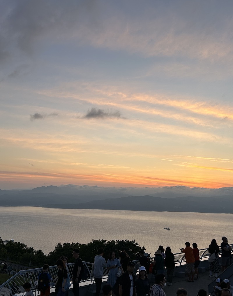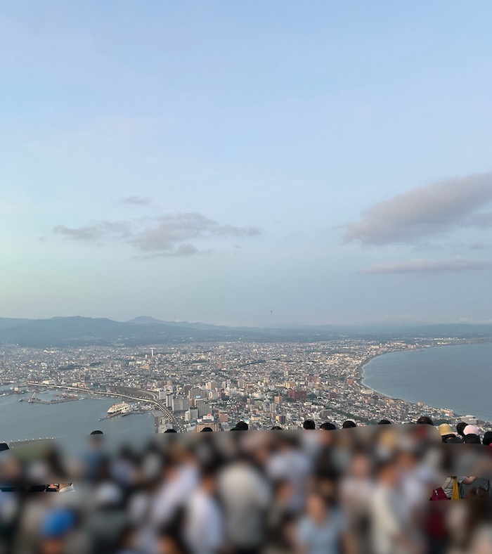 帰りの終バスに乗れなくなる人もいるとか、帰りのロープウエイが2時間待ちだとか、聞こえてくるのはほとんど脅しのようなアナウンス。それにしたってなんでこんなに人が…。人がすごすぎて、身長が180㎝くらいないと、ひとだかりの後頭部と空しか見えない、そんな函館山の展望台。