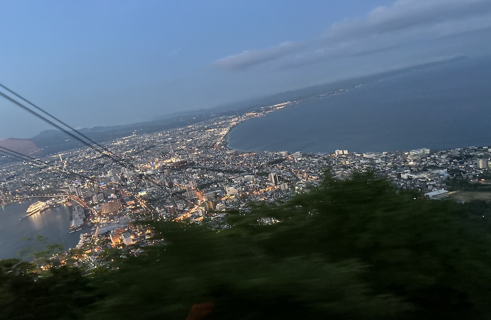 帰りのバス、恐ろしいアナウンスに早めに並んだからか、窓際に座ることができまして、下る道すがら、木立の合間から見えた函館の夜景の切り取り。
