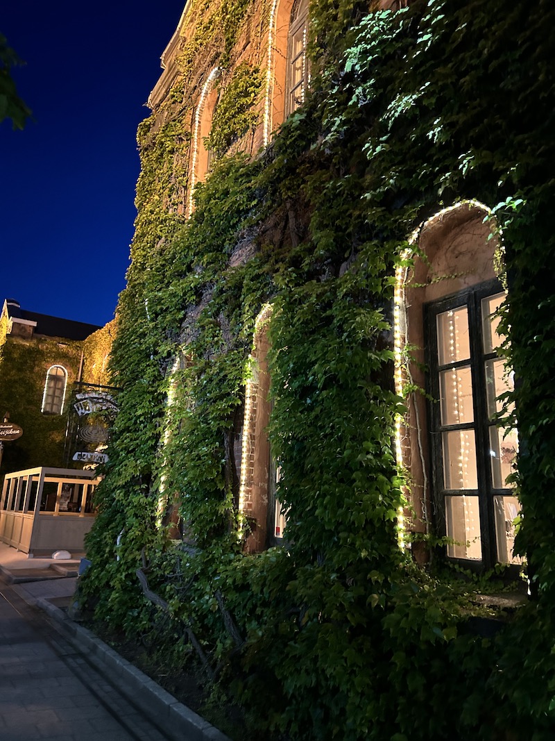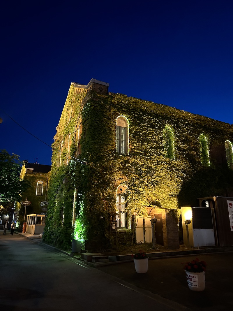 月明かりと、オレンジ色の街燈が浮かび上がらせる赤レンガ。