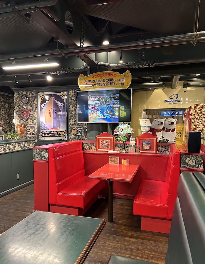 中に入ったらこういう感じで、なかなか派手。レトロ感万歳なんだけど、なんならテキサスの飲み屋の羽扉を押し開けないといけないような雰囲気。