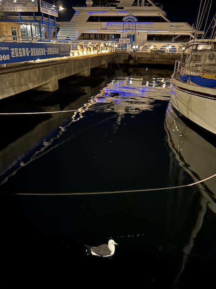停泊するクルーザーの間で浮かぶカモメなんて、本物にみえないくらい。