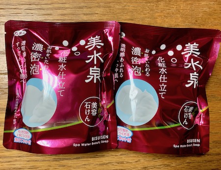 なんか、泡立ちとその泡のもっちり感がとにかく気に入りまして。1個1,100円(税込)、2個買ったら1個おまけ、というのがあったので、もうね、3個入りを購入してしまいました。温泉に行って、自分に石鹸3個買って帰ることになるなんて、ちょっと想定外。