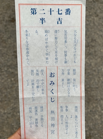 半吉でございました…半吉って、吉の半分だよね、中吉と同じじゃなくて、下だよね…?初めて見た。思わず帰ってから検索しましたら、「熱田神宮 半吉」で検索している人が結構いるみたいです。やはり、吉が半分ってことのようです。
