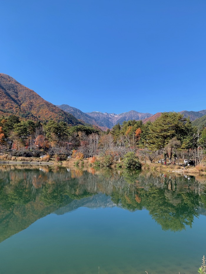 なんでも、山々からの湧き水は冷たすぎるので一度ここで貯めてから農業用水として利用されるらしいのですが、鏡池レベルに映り込む景色。普段は結構風が強いらしいのだけれど、私たちが行った日は、格別にお天気に恵まれたようでした。