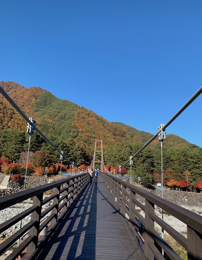 橋を渡って、川沿いをお散歩しながら、マルス信州蒸留所へ。