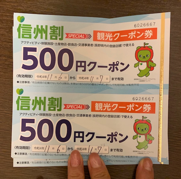 旅行支援クーポンは、長野のゆるキャラ、アルクマがかわいい。そして、なんてありがたいのー。